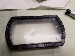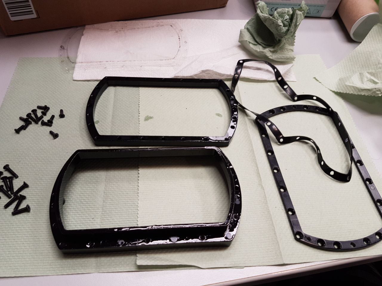 First simply remove all screws and disassemble the three frame parts, the old foil and the rubber gasket. Clean all parts with isopropyl alcohol.